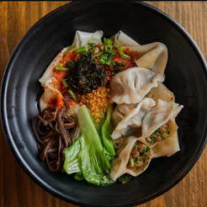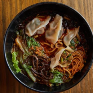 Signature Spicy Noodles in Soup with Chive and Pork Dumplings
